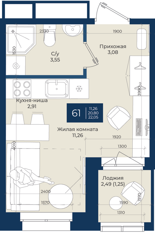 Площади — от 65 до 75 м², что делает квартиры просторными и функциональными.